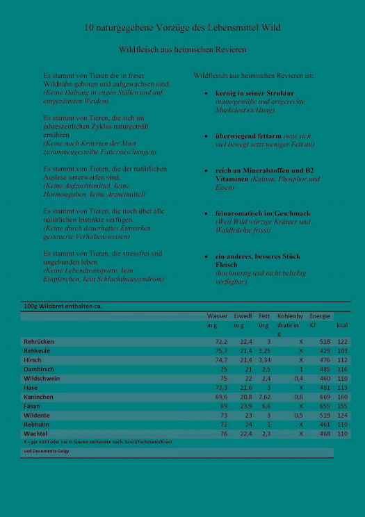 Unser angebotenes Wild stammt garantiert aus freier Wildbahn und enthält deshalb keine Rückstände an Medikamenten oder sonstigen wachstumsfördernden Stoffen.